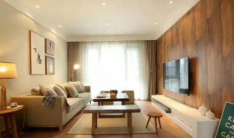Wooden materials can add some sense of nature and warmth, and can be used not only on the floor, but also on furniture, such as TV wall backgrounds, wooden small coffee tables, reclining chairs, carved small objects, etc., which can add to the living room. comfort.
